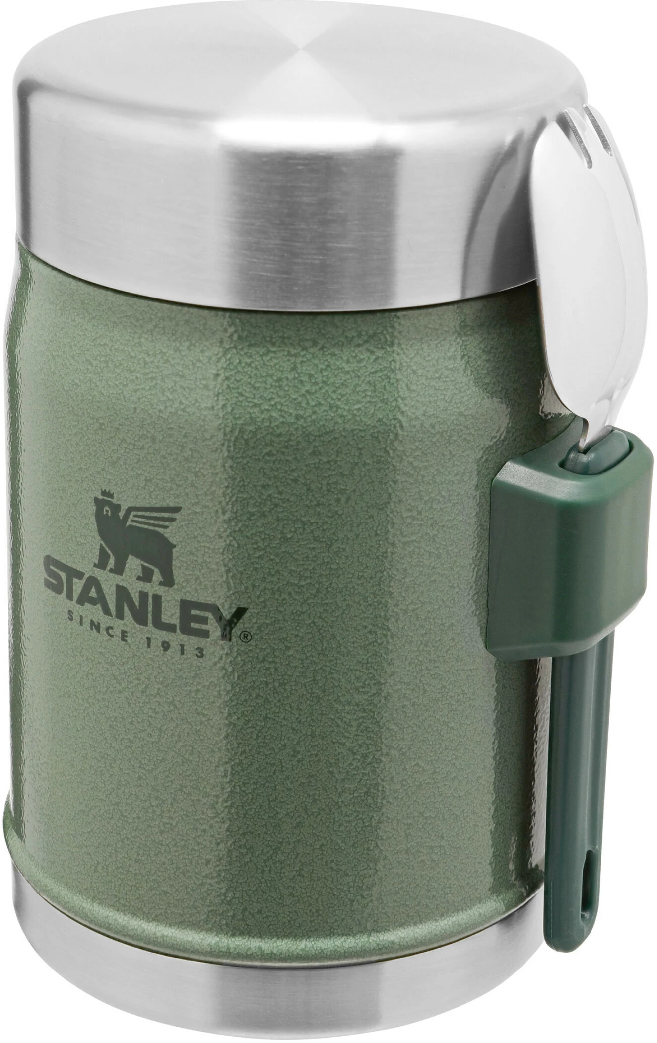 De hamerslaggroene Stanley Classic Food Jar en Spork is perfect voor die kleine warme maaltijd. Met een inhoud van 0,4 liter houdt de voedselcontainer warm voedsel tot 7 uur lang warm. Ook koud voedsel blijft tot 7 uur koud dankzij de dubbelwandige vacuΓΌmisolatie van roestvrij staal. De Classic Food Jar en Spork is lekvrij en compact. Bij de levering is een roestvrij stalen spork inbegrepen, d.w.z. een lepel/vorkgereedschap. Het product is vaatwasmachinebestendig en BPA-vrij.
