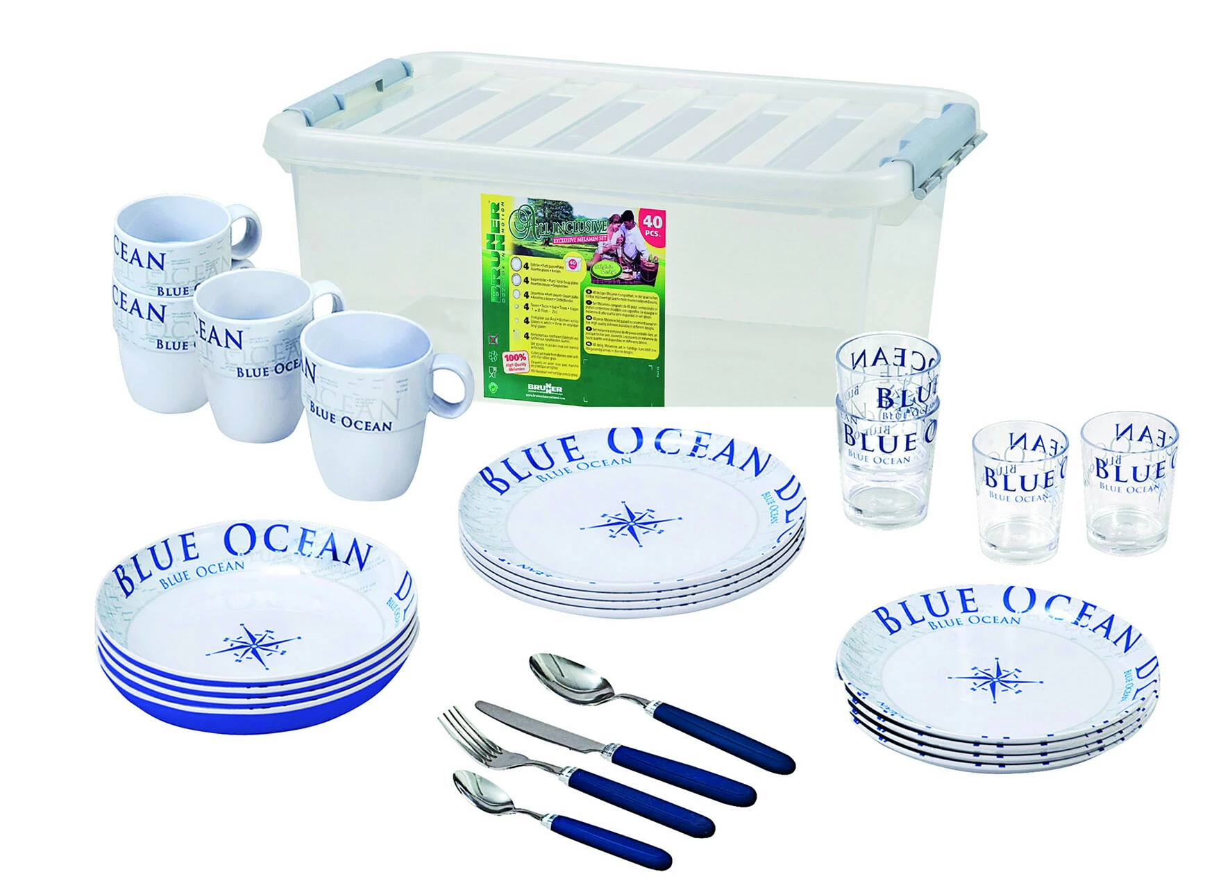 36-delig compleet melamine servies met transportdoos. Alle onderdelen met antislipsysteem.