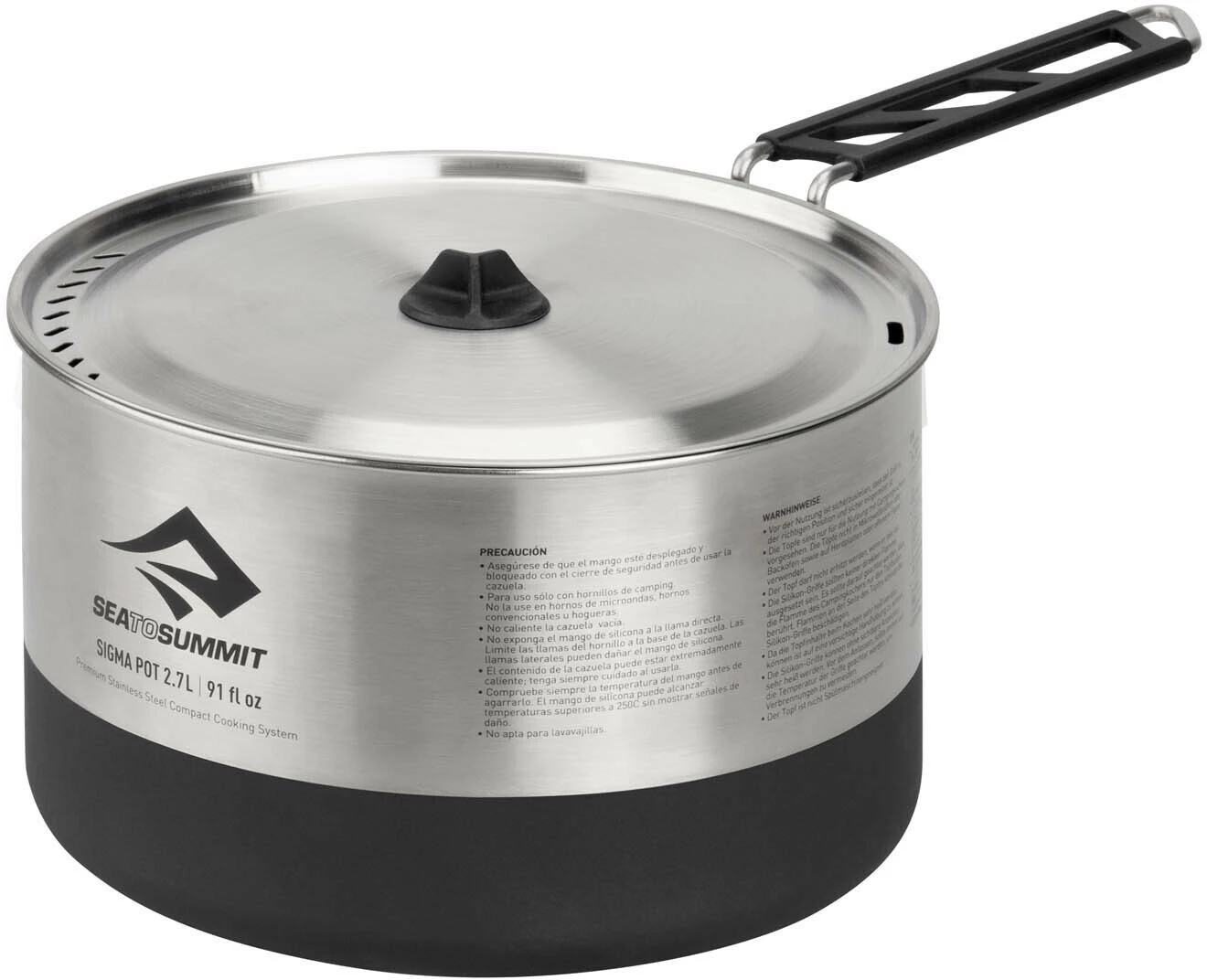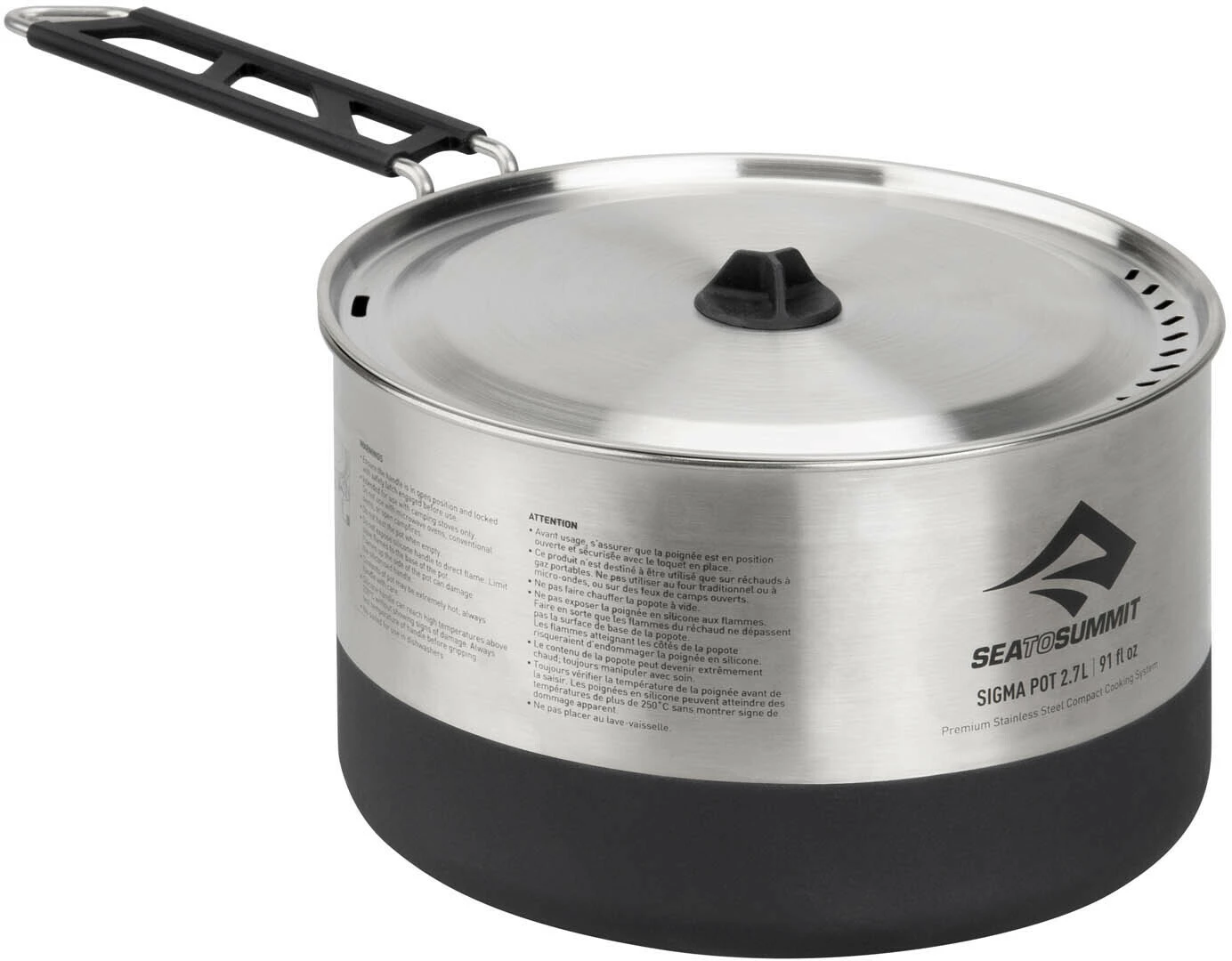 De Sea to Summit Sigma Pot in roestvrij staal is van topkwaliteit en biedt duurzame prestaties voor buitenkoken. De Sigma Pot is gemaakt van hoogwaardig roestvrij staal en heeft een doorlaatbare zeef in het deksel voor het gemakkelijk schenken van water en een gegraveerd patroon op de bodem van de pot die de pot stabiel houdt op elk campingfornuis. Het unieke, gepatenteerde PIVOT-LOCK handvat (met veiligheidsvergrendeling) zorgt ervoor dat de pan tijdens het gebruik comfortabel in de hand ligt. Het handvat kan ook worden ingeklapt en houdt het deksel aan de pan vast voor gemakkelijk transport. Sea to Summit’s Fluxtherm behandeling zorgt voor een gelijkmatige warmteverdeling om de kookefficiΓ«ntie te maximaliseren, terwijl de geΓ―ntegreerde LID KEEP vuil uit het deksel houdt. De compacte Sigma Pots zijn compatibel (passen in elkaar) met de SigmaPans, DeltaLight schotels en zelfs de aluminium AlphaPots en AlphaPans.