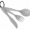 Praktische 8-delige buitenvoedselset met alles wat u onderweg nodig heeft: twee diepe borden, kruidenblik met drie compartimenten, klein bakje voor bijv. afwasmiddel of olie, goed sluitend opbergbakje, drinkschaal, opvouwbare spork en gecombineerde snijplank, pons, rasp en mes.