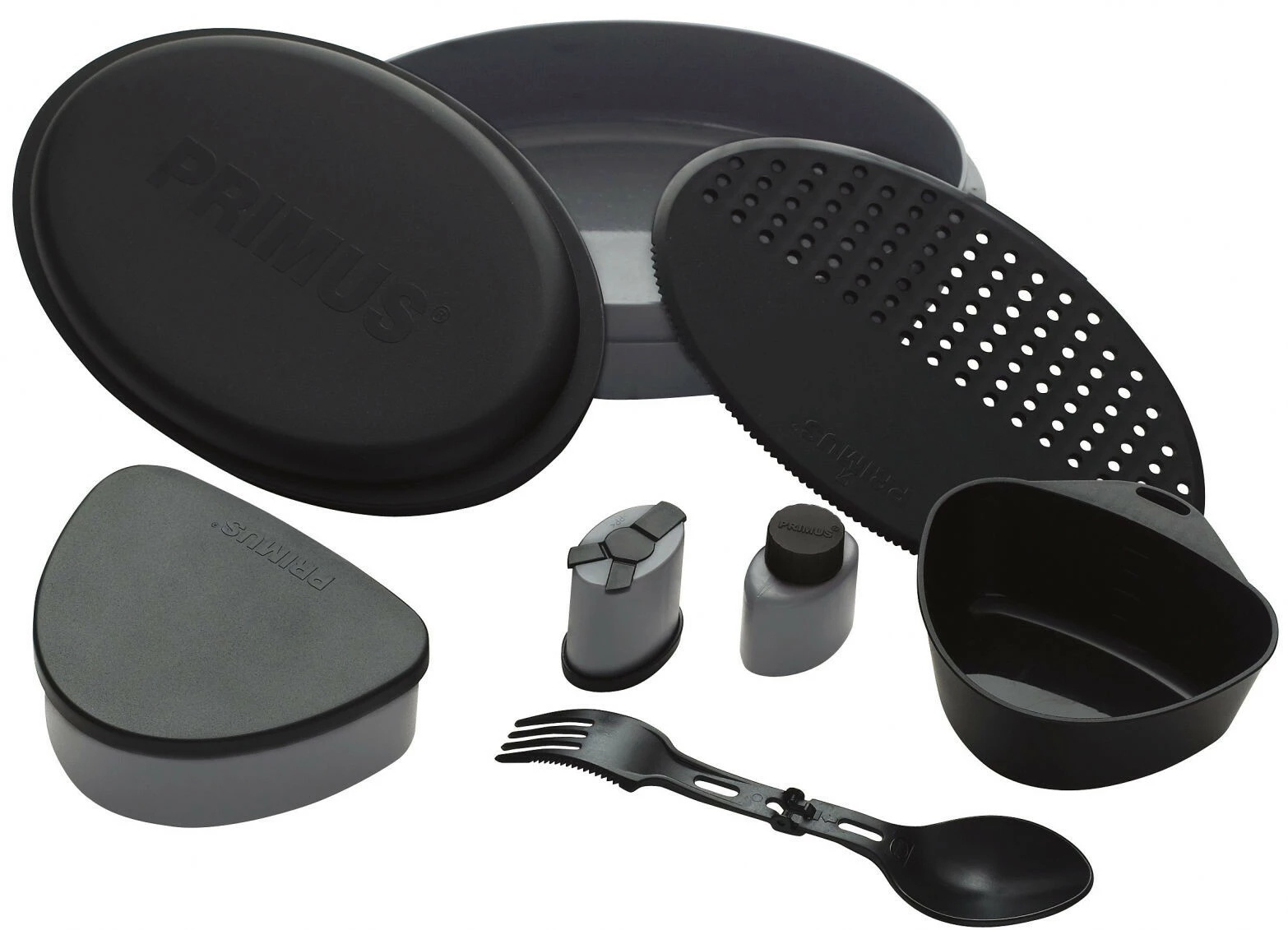 Praktische 8-delige buitenvoedselset met alles wat u onderweg nodig heeft: twee diepe borden, kruidenblik met drie compartimenten, klein bakje voor bijv. afwasmiddel of olie, goed sluitend opbergbakje, drinkschaal, vouwbaar spork en gecombineerde snijplank, pons, rasp en mes. Geschikt voor vaatwasser en magnetron.